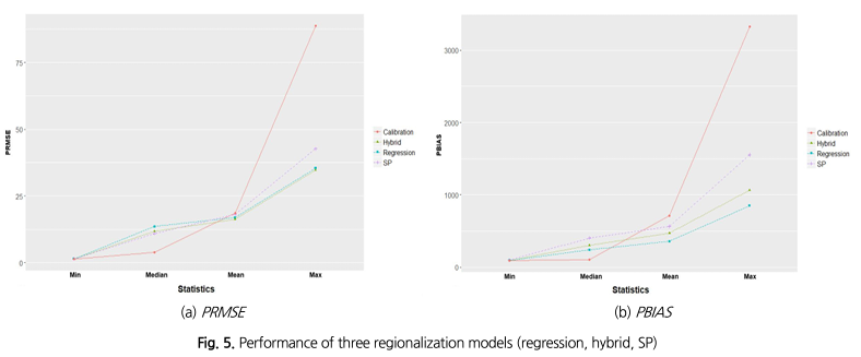 Numerous ungauged watersheds remain in Korea owing to limited spatial and temporal streamflow data with which to estimate hydrological model parameters. To deal with this problem, various regionalization approaches have been proposed over the last several decades. However, the results of the regionalization models differ according to climatic conditions and regional physical characteristics, and the results of the regionalization models in previous studies are generally inconclusive. Thus, to improve the performance of the regionalization methods, this study attaches hydrological model parameters obtained using a spatial proximity model to the explanatory variables of a regional regression model and defines it as a hybrid regionalization model (hybrid model). The performance results of the hybrid model are compared with those of existing methods for 37 test watersheds in South Korea. The GR4J model parameters in the gauged watersheds are estimated using a shuffled complex evolution algorithm. The variation inflation factor is used to consider the multicollinearity of watershed characteristics, and then stepwise regression is performed to select the optimum explanatory variables for the regression model. Analysis of the results reveals that the highest modeling accuracy is achieved using the hybrid model on RMSE overall the test watersheds. Consequently, it can be concluded that the hybrid model can be used as an alternative approach for modeling ungauged watersheds.
